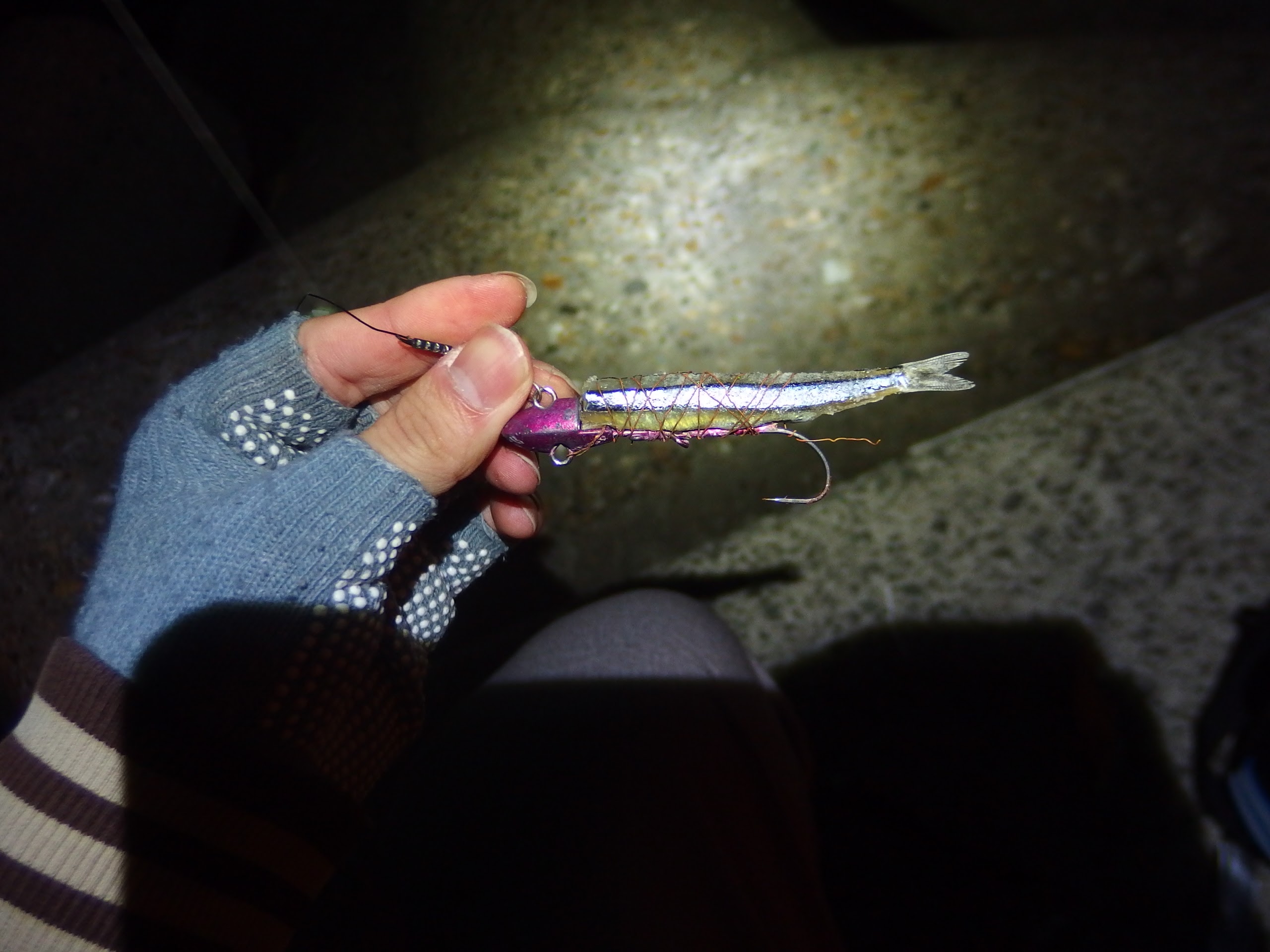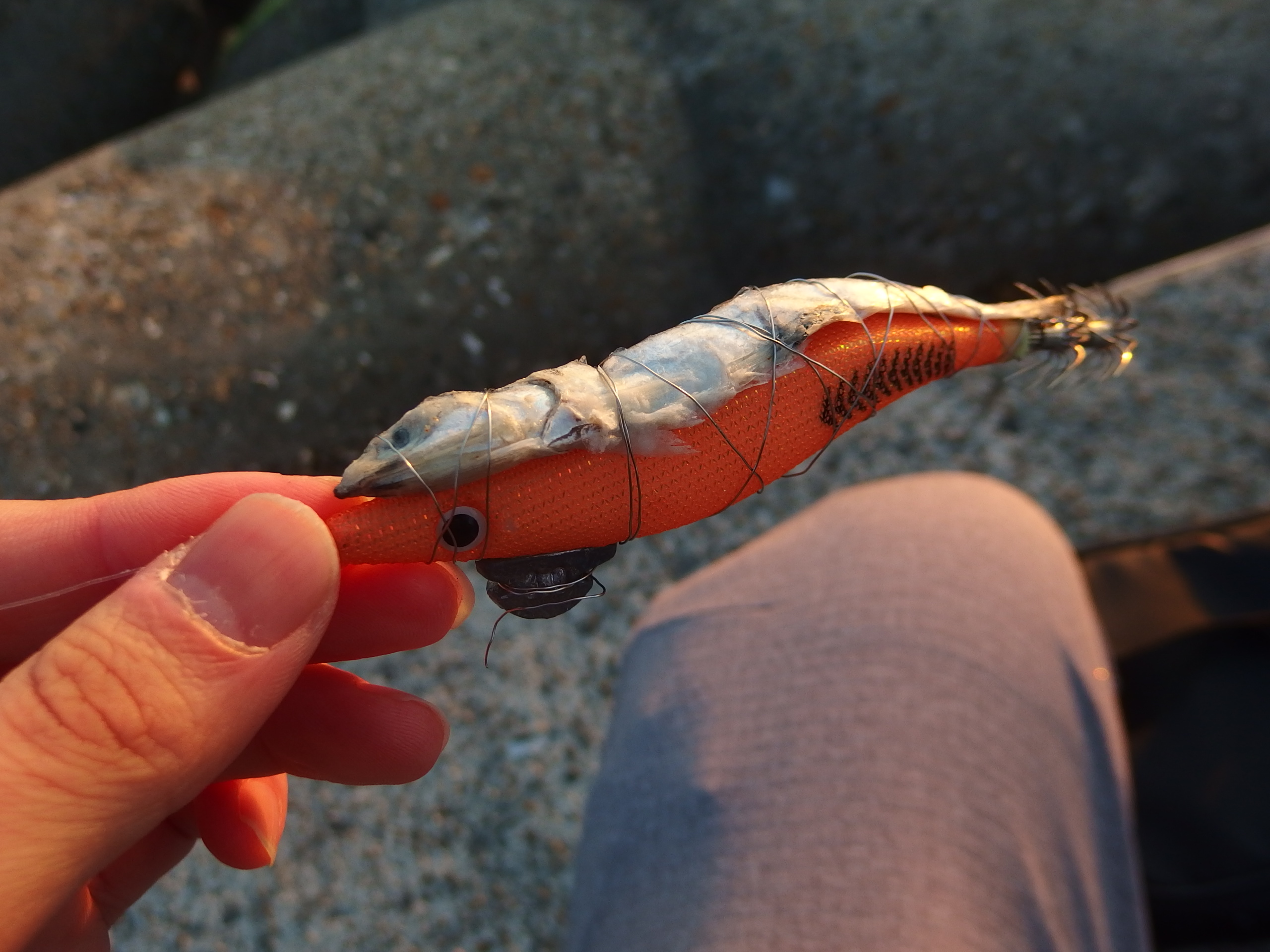 とりあえず餌乗っけれるエギに塩漬けしたイワシつけてシャクリシャクリ開始や。